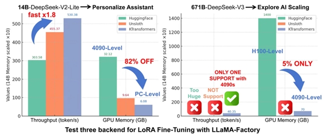 针对模型微调的核心需求,KTransformers与LLaMA-Factory深度集成,支持LoRA等轻量级微调方法,仅占用约41 GB显存+2T内存,就能实现46.55 token/s的微调吞吐量。传统上,LoRA微调千亿模型成本高达数百万,而趋境的异构微调能力将资源需求降低到单个消费级GPU(如 RTX 4090)起,这使得高校、中小型实验室、初创公司甚至个人开发者都有机会参与进来。该方案在 DeepSeek-14B 模型上展现了超过传统方案1.8倍的吞吐、显存占用降低82%,是消费级显卡上微调超大参数MoE模型的唯一可行方案。